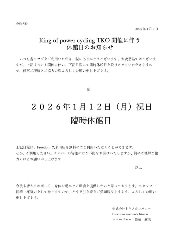 また、臨時休館日は、メンバー区分に関わらず、久米川店を無料でご利用いただけますので